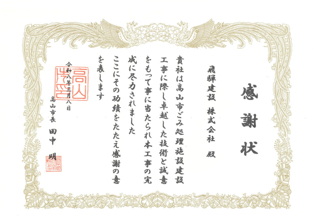 高山市資源リサイクルセンターが竣工しました 2026年3月9日 by 飛騨建設株式会社 / 0件のコメント 先日高山資源リサイクルセンターが竣工しました。 高山市長様より感謝状を贈呈いただきました。 施設案内 高山市資源リサイクルセンター|高山市