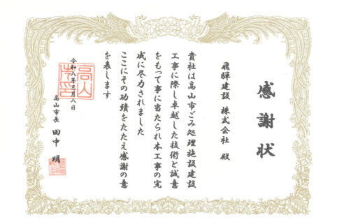 先日高山資源リサイクルセンターが竣工しました。 高山市長様より感謝状を贈呈いただきました。 施設案内 高山市資源リサイクルセンター|高山市